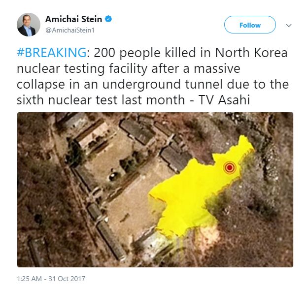 200 persone sono morte dopo un incidente in uno dei centri di prova nucleare della Corea del Nord. Circa 100 persone sono state uccise quando un tunnel incompiuto è crollato nella centrale di Punggye-ri della Corea del Nord. Un altro gruppo di circa 100 persone è morto in seguito nel tentativo di salvare i lavoratori dal. Il disastro è stato rivelato oggi dalla TV del Giappone Asahi, anche se non hanno saputo chiarire quando l’incidente e i successivi tentativi di soccorso si sono verificati.