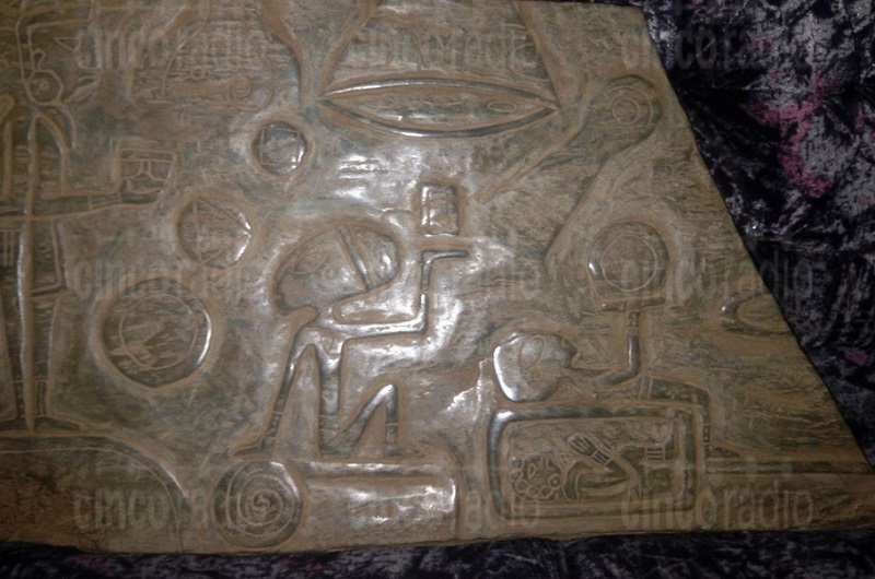 L’immagine mostra un extra-terrestre a fianco di un essere umano della cultura pre-ispanica e la persona sta dando qualcosa all’alieno. Ci sono altri simboli strani sulle pietre che non sono ancora stati decifrati.