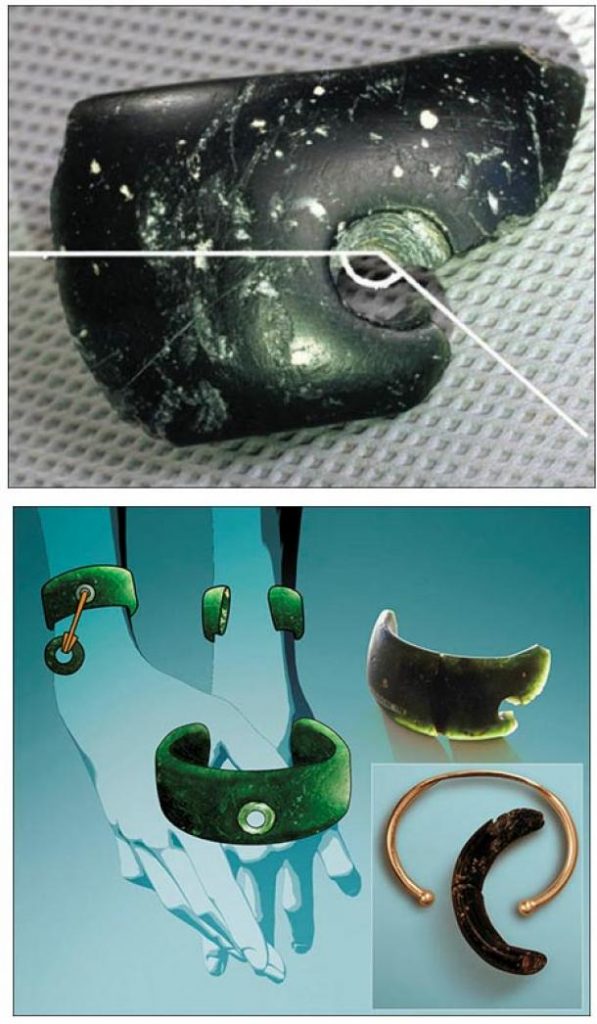 Secondo gli scienziati, il bracciale è stato lucidato con metodi sconosciuti. Sorprendentemente, la pietra era ancora a quando i ricercatori l’hanno trovato. I frammenti che sono stati trovati del bracciale, hanno permesso ai ricercatori di ricreare visivamente il capolavoro di questa lavorazione antica. Si ritiene che il braccialetto è stato portato intorno al polso. Una striscia, si suppone è stata fatta attorni al foro della pietra. Il mistero più grande è il buco che attraversa il bracciale, in quanto la precisione è anche migliaia di anni in anticipo sui tempi.