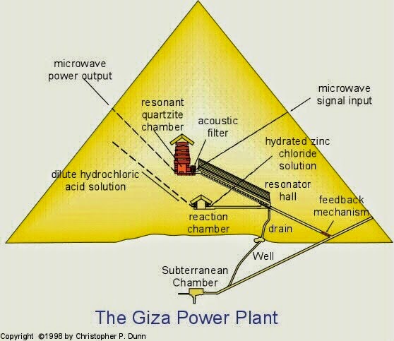 Nel lavoro di diversi importanti ricercatori figura quello di Christopher Dunn, un ingegnere meccanico inglese, che nel suo libro The Giza Power Plant: Technologies of Ancient Egypt afferma che la Grande Piramide di Giza fosse utilizzata come centrale elettrica wireless, sul modello delle intuizioni di una delle più grandi menti del secolo scorso: Nikola Tesla.