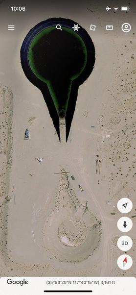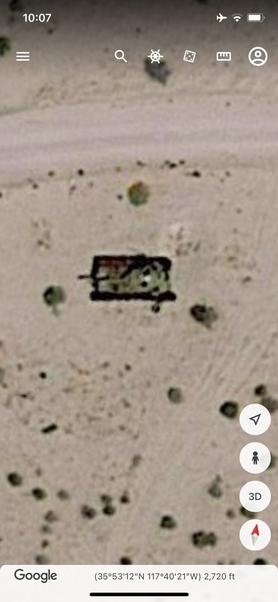 Per dimostrare che la foto non è falsa, l’utente ha pubblicato anche le coordinate del suo ritrovamento (35°53’21”N 117°40’15”W). Vicino all’oggetto nero, si vede un’enorme depressione a forma di lacrima lunga 103 metri. Secondo il detective di Internet, è il luogo di atterraggio di un’enorme astronave.
