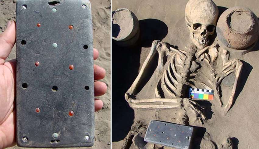 I ricercatori che hanno partecipato a questo progetto archeologico hanno trovato questo manufatto di 18 × 9 centimetri all’interno della tomba di una donna. Un’analisi più dettagliata del manufatto ha rivelato che il possibile dispositivo antico è costituito da pietre preziose grigio scuro e da pietre colorate semipreziose e monete wuzhu cinesi come decorazioni. Le pietrre sono di vario colore, turchese, corniola e madreperla.