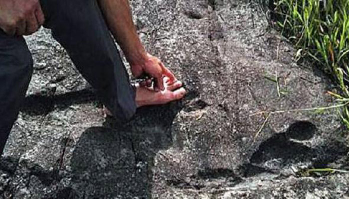 È stato confermato che l’archeologo Michael Tellinger è stato fotografato accanto a queste impronte giganti, che hanno 200 milioni di anni.