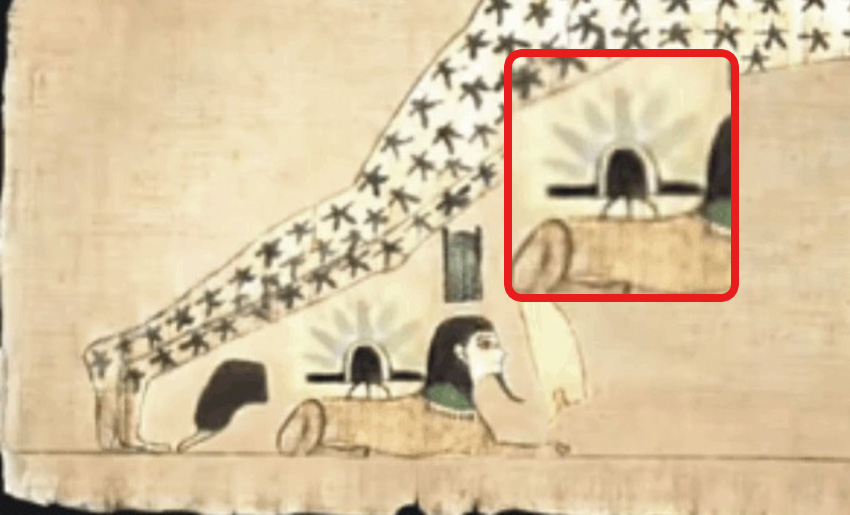 L’enigmatica vignetta di 3.000 anni fa del papiro funerario di Djedkhonsuiefankh, esposta al Museo del Cairo, illustra una scena incredibile: un oggetto a forma di disco, raffigurato come estremamente luminoso, con un dispositivo di atterraggio dispiegato in cima a una Sfinge.
