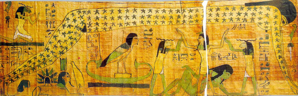 Questo antico papiro – si può vedere qui – è descritto in uno studio intitolato: Cosmic Space and Archetypal Time, Depictions of the sky-goddess Nut in three royal tombs of the New Kingdom and the relation to the Milky Way, by Amanda-Alice Maravelia (Spazio Cosmico e Tempo Archetipo, Rappresentazioni della dea del cielo Nut in tre tombe reali del Nuovo Regno e la relazione con la via lattea – di Amanda-Alice Maravelia)