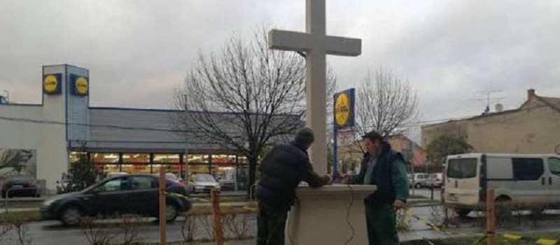 Una enorme croce eretta proprio di fronte alla Lidl, per protestare contro alcune scelte di marketing che censurano l’identità cristiana d’Europa.
