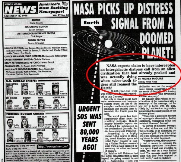 “Gli scienziati della NASA dichiarano di aver intercettato una richiesta di aiuto intergalattica da parte di una civiltà extraterrestre in declino, che stava morendo mentre i tigri dai denti a sciabola ancora vagavano sulla Terra”.