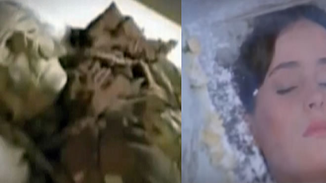 Quella gente rimase stupefatta, notando che lì c’era una donna, ma il suo corpo era intatto, come se fosse stato sepolto da poco tempo. Il suo corpo era dentro uno strano liquido, di colore blu-rosa trasparente, che sembrava tenerla in quelle condizioni.