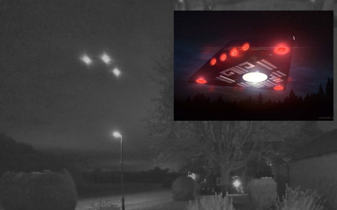 Una telecamera di sorveglianza installata nel cortile di una casa ha registrato un UFO triangolare, o tre oggetti luminosi, che si muovevano lentamente ma con decisione nel cielo scuro.