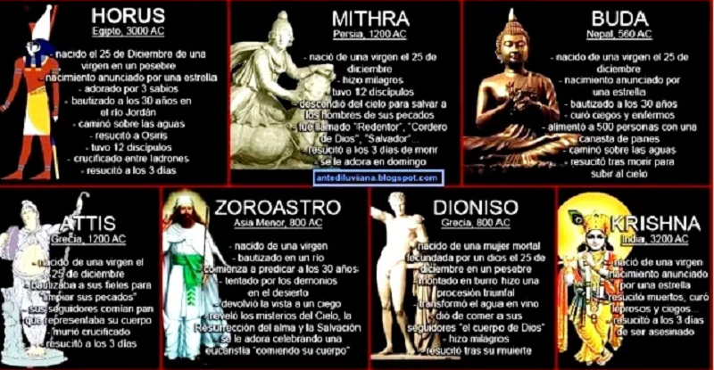 Mithra, in Persia 1200 aC, nato da una vergine il 25 dicembre, aveva 12 discepoli e compiva miracoli, e alla sua morte fu sepolto e resuscito’ dopo 3 giorni. Il giorno sacro dedicato a Mithra era la Domenica.