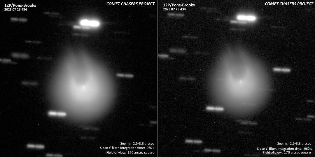 La cometa 12P/Pons-Brooks (12P) sembra avere le corna! Recentemente, durante il suo viaggio nello spazio, la cometa 12P/Pons-Brooks ha avuto un improvviso aumento di luminosità, diventando circa 100 volte più brillante in una sola notte. Questo fenomeno è noto come “outburst” e ha portato a una curiosa forma a “ferro di cavallo” con una coma dalla quale spuntano due “corna” simili a quelle di un demone.