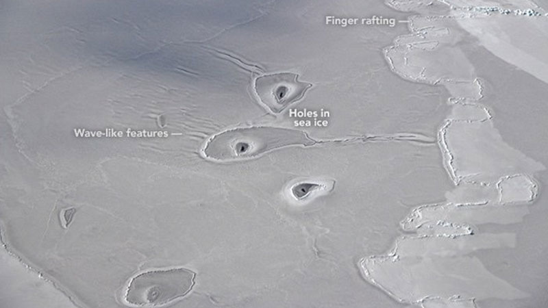 Un’indicazione che il ghiaccio è nuovo è che i buchi emergono da un tipo di movimento a “rafting” che si muove da destra a sinistra, come indicato nella foto in cima all’articolo.