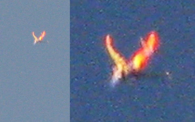 “Eravamo sul nostro balcone, guardando il tramonto e il cielo quando mio marito ha visto delle luci provenienti da ovest. Entrai nella casa per prendere il mio telefono e mio marito è andato a prendere una macchina fotografica Canon, ed ha scattato le immagini per primo. Ho fatto il video con il mio cellulare, mentre lui ha fatto delle foto. Un secondo secondo oggetto è arrivato dalla stessa direzione; Facciamo foto e video. La descrizione migliore è come un uccello una fenice o una forma angelica.Aveva il corpo, di tipo cilindrico con una possibile naso rivolto verso il basso. Le ali erano piegate fino a 80 gradi verso l’atmosfera; Erano di colore arancione incandescente, molto luminose, e sembravano avere un velo triangolare trasparente che sembrava traslucido, apparentemente appeso sulla fascia sinistra con globi lucidi.