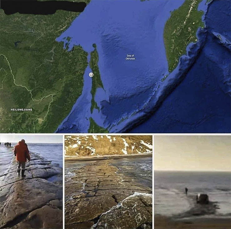 “Qualche giorno fa, dopo una marea insolitamente forte, un enorme sentiero di pietra è emerso da sotto le acque dell’Oceano Pacifico”, si legge nella descrizione che accompagna le immagini. “Lo strano evento ha sorpreso molti abitanti dell’isola di Sakhalin, nell’estremo est della Russia (vicino all’arcipelago giapponese). Il disastroso evento è durato poco, ma è bastato ai vicini per immortalare la struttura e farla vedere a tutti».