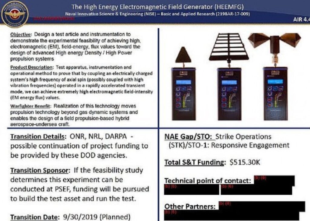 “Ci sono prove che  il generatore di campi elettromagnetici ad alta energia è stato testato  dal 2016 al 2019 e che sono stati spesi 508 mila dollari per questi test. Il team che ha lavorato al progetto era composto da almeno 10 tecnici e ingegneri. Ma alla fine dei test, l’effetto Pais “non è stato dimostrato”, scrive la testata giornalistica.
