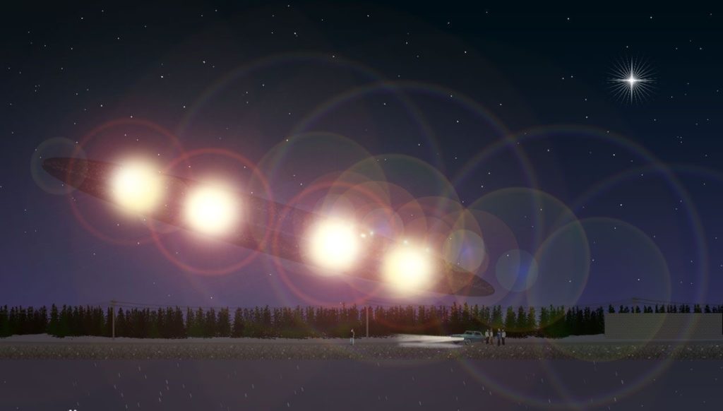 Lo descrissero come una fila di quattro grandi luci arancioni che lampeggiavano ed emettevano un forte sibilo. Successivamente hanno osservato come “esso” fosse inclinato di 45 gradi intuendo che avrebbe avuto un impatto sulla superficie del mare.