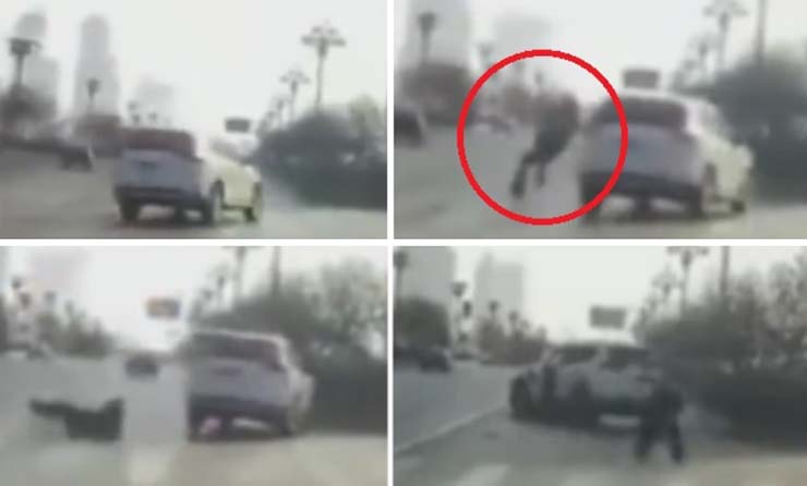 Nelle immagini è possibile vedere un veicolo sportivo (SUV) che si muove nella corsia di sinistra ad una velocità sicuramente normale. Non ci sono persone e il traffico sembra fluido. ma improvvisamente, il SUV gira bruscamente a destra e il motivo per questo è una persona che compare dal nulla . Il veicolo lo colpisce violentemente contro la spalla, mentre l’individuo è a terra. Poi si alza e inizia a camminare come se nulla fosse accaduto in modo assente.