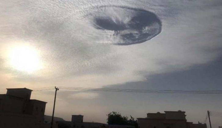 Secondo il giornale Gulf News , lo strano fenomeno era di circolare ed è emerso nel cielo sereno all’interno di una nuvola, vicino al confine con l’Oman, come se qualcuno avesse praticato un foro nell’atmosfera.